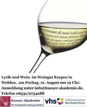 Der Wein erfreut des Menschen Herz, berauscht seine Sinne und seinen Verstand, er beflügelt ihn und kann ihn auch stürzen: Seit Jahrhunderten wird der Wein besungen, wird er gelobt, vor ihm gewarnt. Die Kueser Akademie stellt Gedichte aus mehreren Jahrhunderten vor, die sich dem Wein widmen. Und natürlich soll es am Wein selbst nicht fehlen!