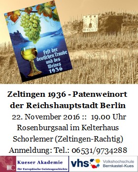 Nie zuvor - und auch nie danach(!) - hat es in Deutschland eine gewaltigere Absatzaktion für die heimischen Winzer gegeben: Unter der eingängigen Parole "Wein ist Volksgetränk!" entfaltete das NS-Regime in den Vorkriegsjahren des Dritten Reiches eine groß angelegte Weinpropaganda, die das Trinken deutschen Rebensaftes als geradezu nationale Tat beschwor. Und mehr noch: 1936 und 1937 übernahmen annähernd 1000 Städte von Ostpreußen bis nach Hinterpommern besondere "Weinpatenschaften" für einzelne Winzerorte, wobei im Rahmen eines im ganzen Reich stattfindenden "Festes der deutschen Traube und des Weines" vom Parteiapparat der NSDAP allerorten volkstümliche Weinfeste und Umzüge organisiert worden waren. Bei diesem Werbespektakel hatte im Herbst 1936 insbesondere die Moselgemeinde Zeltingen das große Los gezogen: War dem Winzerort doch ausgerechnet Großberlin mit seinen 1,2 Millionen Einwohnern als Weinpatenstadt zugeteilt worden. Daraufhin wurde eine Zeltinger Delegation, bestehend aus örtlichen (Partei-)Honoratioren und Sängern, in der Reichshauptstadt wie Staatsgäste empfangen; annähernd 450 Fuder heimischen Rebensaftes fanden innerhalb der Weinwerbewoche an der Spree begeisterten Absatz... "Zeltingen 1936 - Patenweinort der Reichshauptstadt Berlin", so lautet folgerichtig das Thema eines Vortrages, in dem der Traben-Trarbacher Museumsleiter Dr. Christof Krieger an dieses ungewöhnliche Ereignis vor 80 Jahren erinnern möchte. Der promovierte Historiker, der sich in seiner Doktorarbeit an der Universität Trier mit der nationalsozialistischen Weinpropaganda an Mosel, Saar und Ruwer beschäftigte, gibt anhand zumeist unveröffentlichter Quellen überraschende Einblicke in ein weithin unbekanntes Kapitel der Heimatgeschichte.