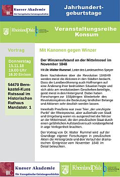 Beim Nachdenken über die Revolution 1848/49 werden meist die Aktionen in den Städten bedacht. Dass die Landbevölkerung auch Hoffnungen auf eine Änderung ihrer bedrückten Situation hegte und sich aktiv am revolutionären Geschehen beteiligte, gerät meist in den Hintergrund. Dabei haben Forschungen zur 150jährigen Wiederkehr des Revolutionsjahres die Bedeutung ländlicher Belange und Aktionen sehr deutlich werden lassen. Innerhalb Preußens war zwar Trier "der unruhigste Punkt" der Rheinprovinz, aber außerhalb von Stadt und Umgebung waren es ausgerechnet die Winzer an der Mittelmosel, die den preußischen Staat durch einen gefährlichen Aufstandsversuch vorübergehend in arge Verlegenheit brachten. Der Vortrag von Dr. Walter Rummel wird auf der Grundlage eigener Forschungen in preußischen Akten die Hintergründe und den Verlauf der dramatischen Ereignisse vom November 1848 im Detail beleuchten.